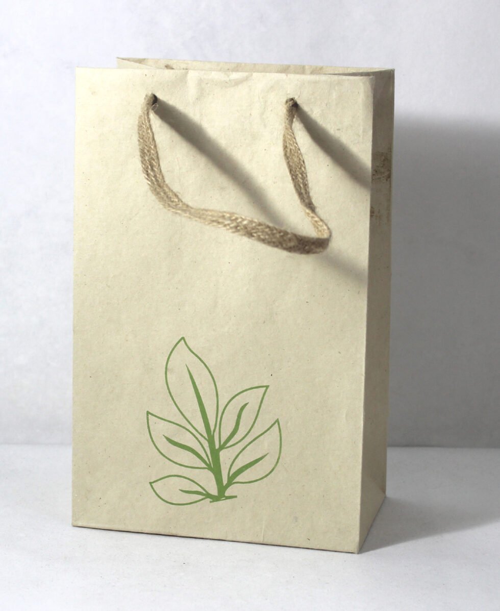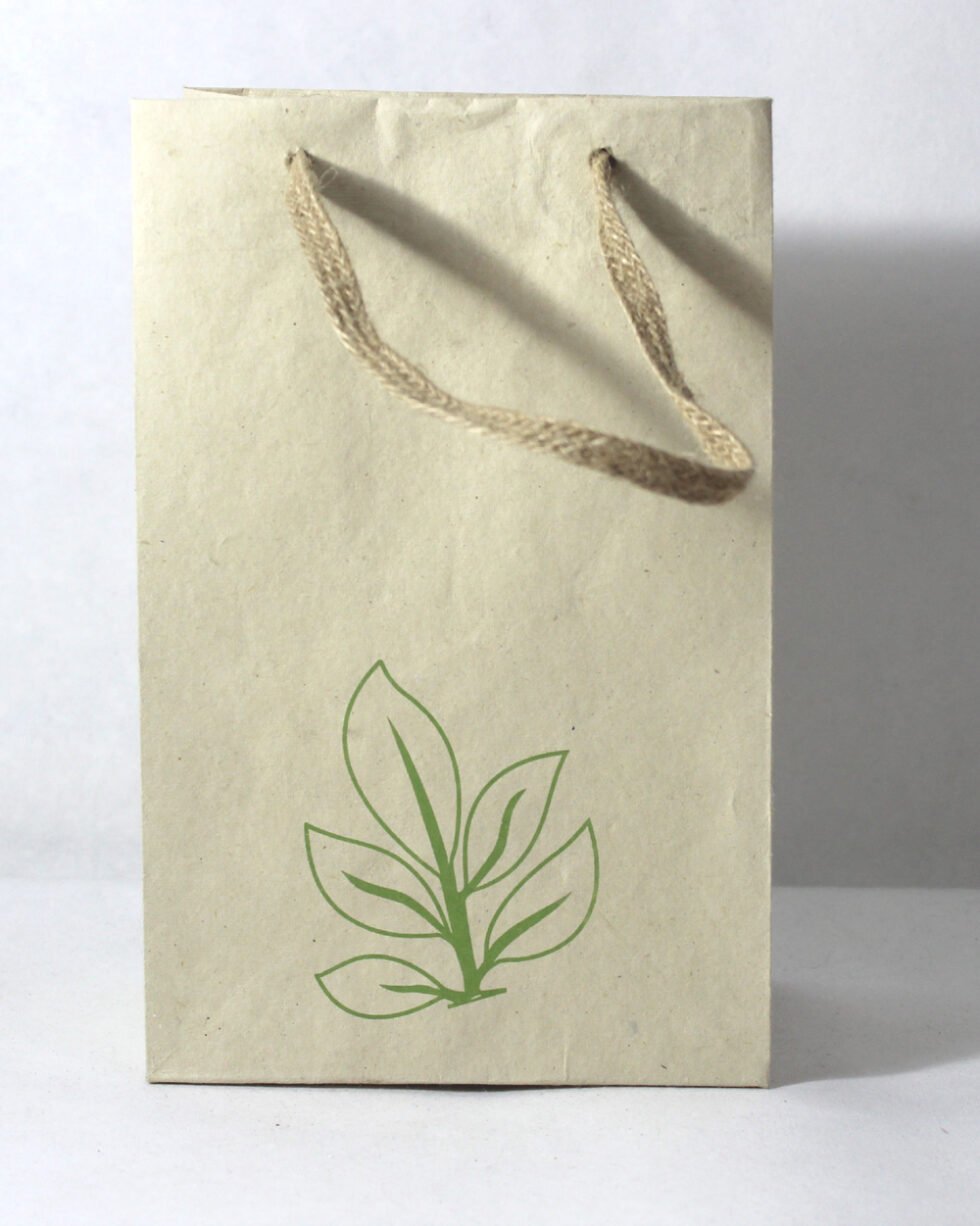 Strong and sturdy hemp paper bag with jute ribbon handles. A green leaf is printed at the front corner, which could well be a logo from any company. Prints can be single or multi colour. The collar and bottom of the bag is further strengthened by a given card sheet inside.