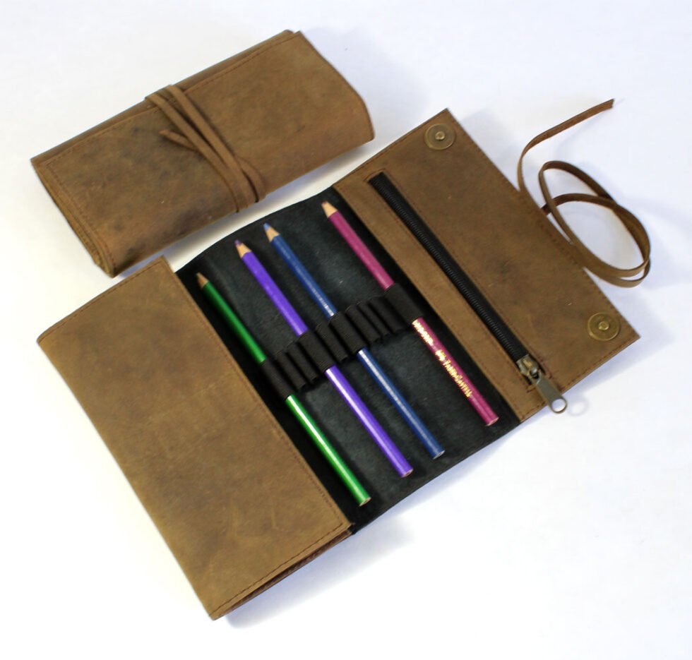 Add a touch of class to your writing tools, pens & pencils and give them a stylish home with this finely handcrafted full grain leather vintage style pencil case! Strong natural leather + 100% handmade – guarantee of a quality product! Oil pull up tannery leather with abrasion effect and antique looks. It is 100% full grain leather, while the rugged & gypsy effect gives the product slightly stiff yet a vintage look! A very useful, aesthetic and beautiful present or product! Leather with the love of labour and craftsmanship unlike conventional tannery dyed leather!