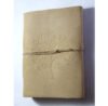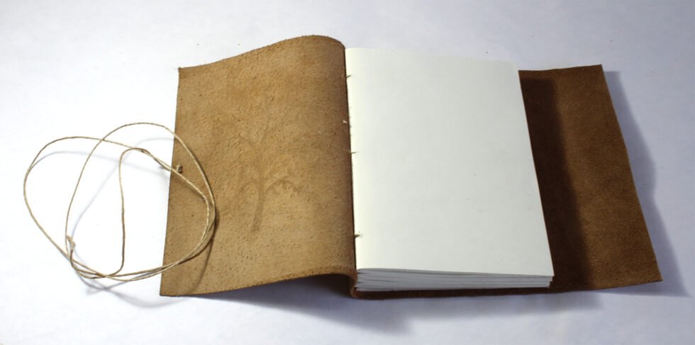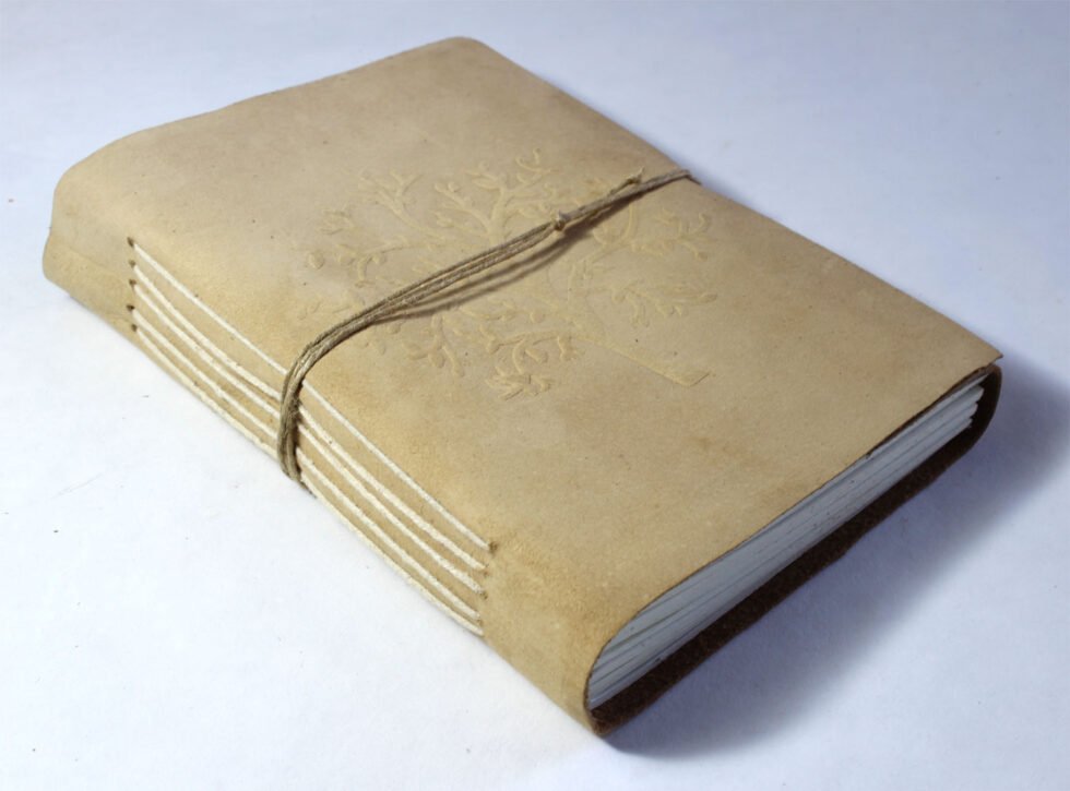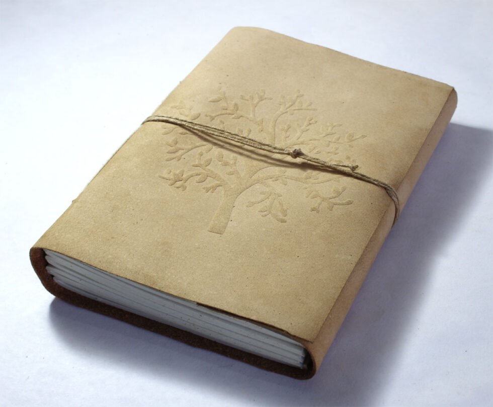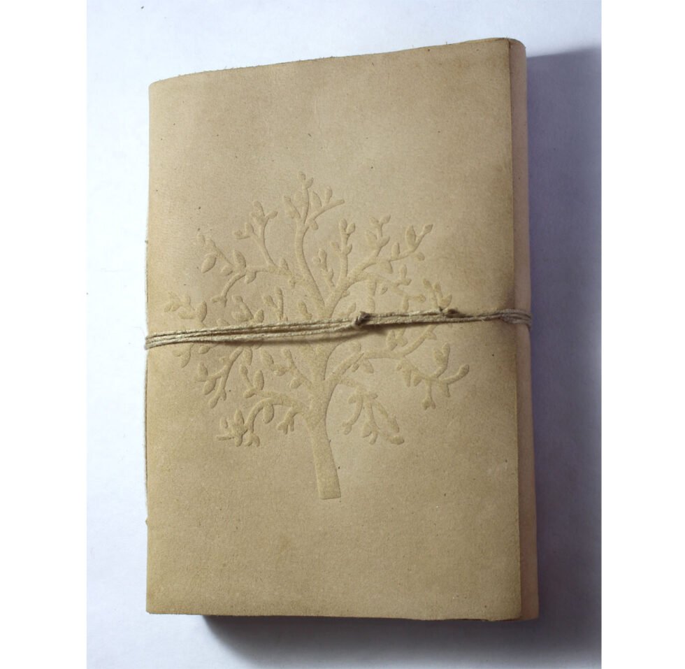 Journal made of natural shade leather & paper only as the binding strings are leather too! Soft and supple khaki brown genuine buffalo leather journal with hard bound 120 sheets / 240 pages of recycled cotton handmade paper. Hand crafted journal with 100% natural leather. The leather is naturally distressed and tanned giving a vintage look with an old ‘Tree of life’ design embossed on the front cover. A travel journal with rugged & gypsy look, exclusive gift! A 2″ closing flap protects the papers inside with the matching strap around it.
