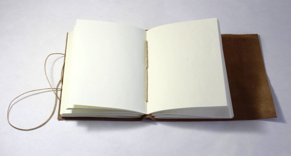 Journal made of natural shade leather & paper only as the binding strings are leather too! Soft and supple khaki brown genuine buffalo leather journal with hard bound 120 sheets / 240 pages of recycled cotton handmade paper. Hand crafted journal with 100% natural leather. The leather is naturally distressed and tanned giving a vintage look with an old ‘Tree of life’ design embossed on the front cover. A travel journal with rugged & gypsy look, exclusive gift! A 2″ closing flap protects the papers inside with the matching strap around it.