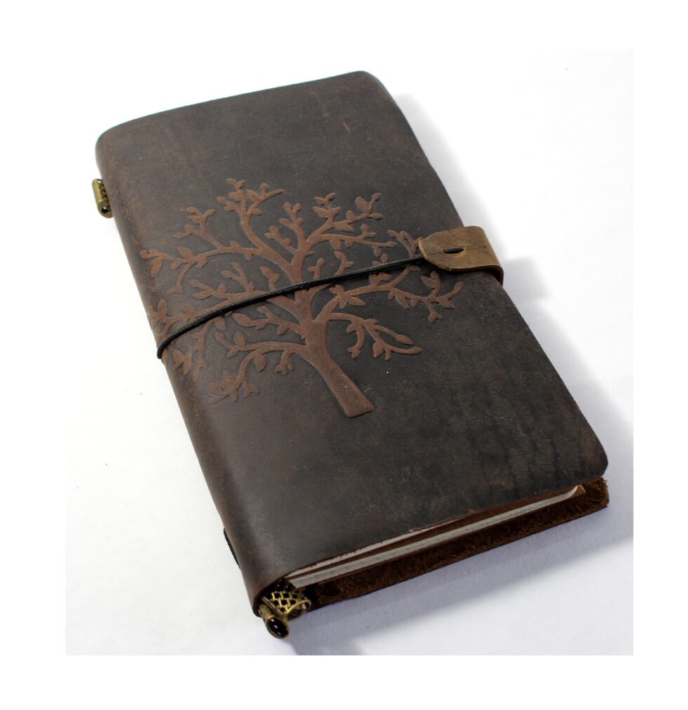 A compact portable travel notebook as personal diary and quick sketch book. The cover is thick rich genuine leather bound to last for the lifetime! On the front cover, ‘Tree of Life’ is embossed. At the back, brown leather is hand stitched to the black leather panel with a matching leather string! Smart refillable design with a use of 3 different paper packs, each 30 sheets / 60 pages, a Kraft holder, a metallic pen holder clip. Tailored for your specific life style and decorated with antique brass beads. Each paper pack / insert has mill made non-bleeding smooth paper with different prints such as lined / dotted / grids / plain or even light brown Kraft paper.