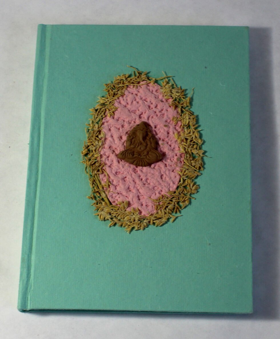 Beautiful collage design by gluing down a special paper in oval shape known as ‘Moon Rock’ on the front cover of the notebook. Further surrounded by the auspicious white grass around its border. In the centre, Lord Ganesh – The God of wisdom & Wealth, is placed, making it a very unique Diwali Present! A beautiful aesthetically made symbolic Diwali Present, and very auspicious too, for someone you wish very special! Just inside both the covers, front and back, there is another thick cream colour wood free / acid free paper sheet layer, holding the inside writing pages gracefully. In the middle, 48 sheets / 96 pages for smooth writing which never bleed with the ink or in calligraphy and can be a lovely travel book / art and craft book or a book – keeping domestic accounts and other valuable notes & details.