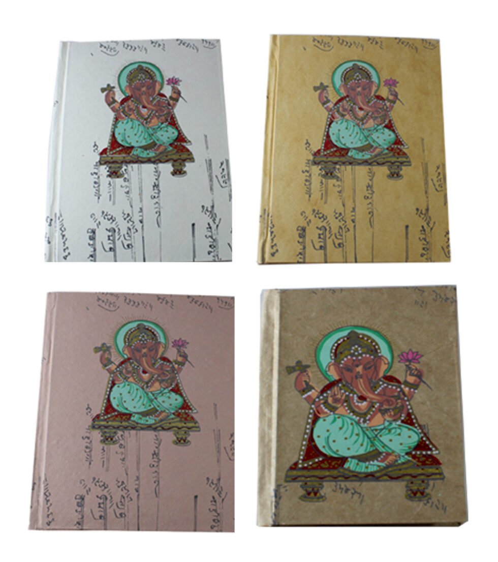Set of 4 pcs antique looking A5 notebooks with old ‘Bahi-Khata’ scripts running all over on recycled cotton handmade paper’s cover. On the front cover, Ganesh – Gord of Wealth & Wisdom is printed in multi-colour. It is silver screen hand print. At the back, auspicious elephant too is printed. A beautiful aesthetically made symbolic Dewali Present, and very auspicious too, for someone you wish very special! Just inside both the covers, front and back, there is another thick cream colour wood free / acid free paper sheet layer, holding the inside writing pages gracefully. In the middle, 48 sheets / 96 pages for smooth writing which never bleed with the ink or in calligraphy and can be a lovely travel book / art and craft book or a book – keeping domestic accounts and other valuable notes & details.