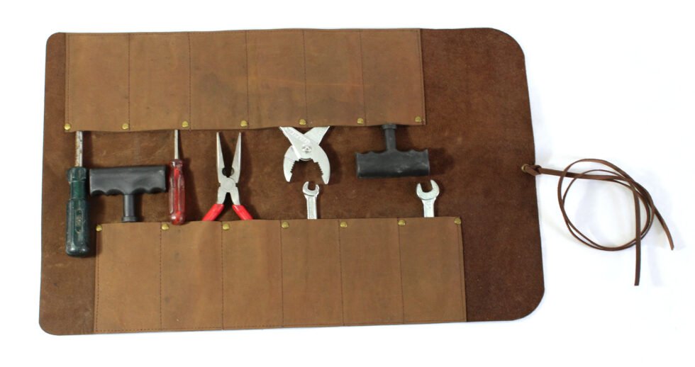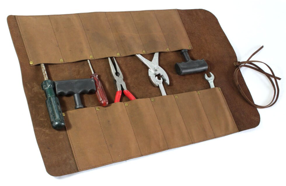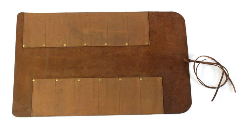 Vintage style tool wrap. Add a touch of class to your tools and give them a stylish home with this finely handcrafted Full Grain Leather Tool Roll. Perfect for “Do it Yourself” enthusiasts, specialists, and even beginners who have accumulated a few tools over time. Crafted using Full Grain Leather for durability and protection, this is a stylish answer to your storage needs for your most prized tools. Plenty of space for your prized tool, With 12 staggered tool slots, you can store a variety of small to medium sized hand tools. Perfect for when you’re on the go as it rolls up neatly and easily and securely closed with a Full Grain Leather cord that ties up in style for that finishing touch of grace and style. Great protection for your prized tools. (Comfortably fits tools in picture that have a 2 inch circumference handle. Longest tool that could fit measures 9 inches in length.)