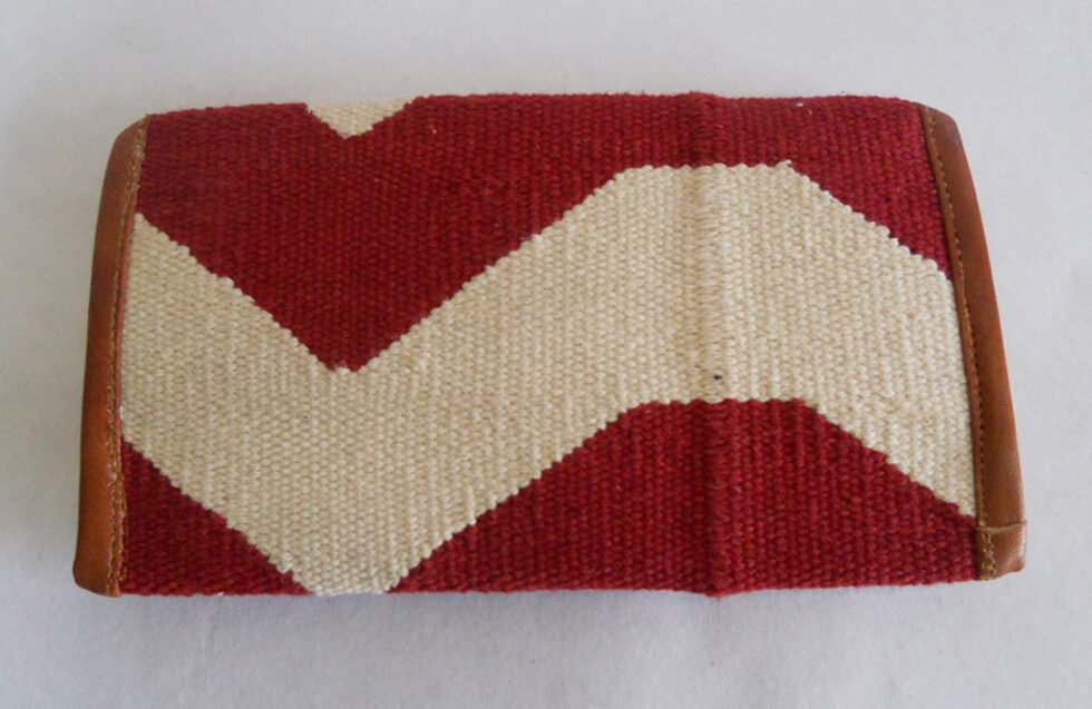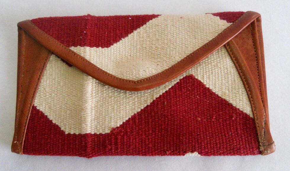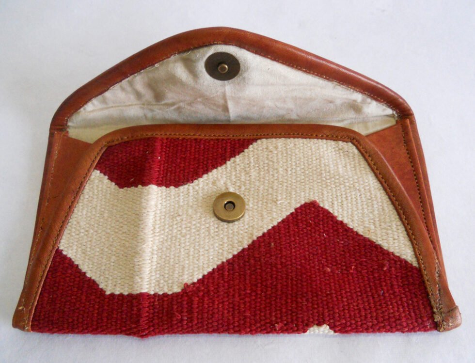 Hand woven cotton kelim / dhurries clutches with genuine leather used decoratively at the edges as piping. Inside is cotton fabric lining. For closure, a touch button is given. Tu rely ethnic product from the cottage industry of Thar Desert of Western India, Rajasthan.