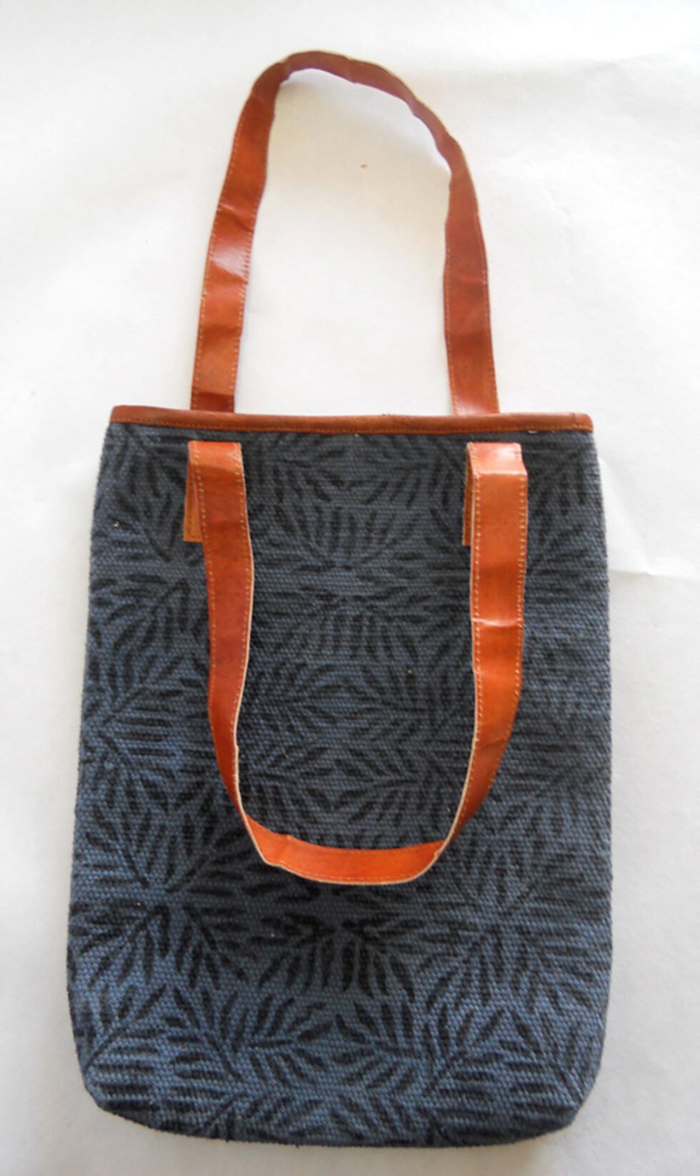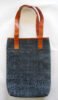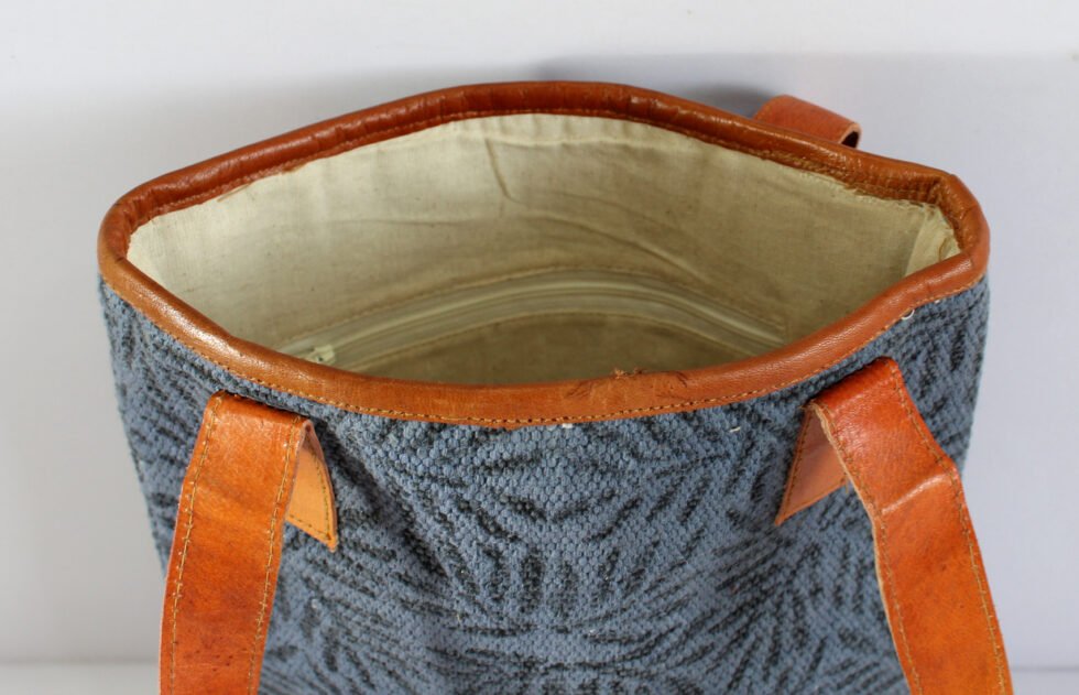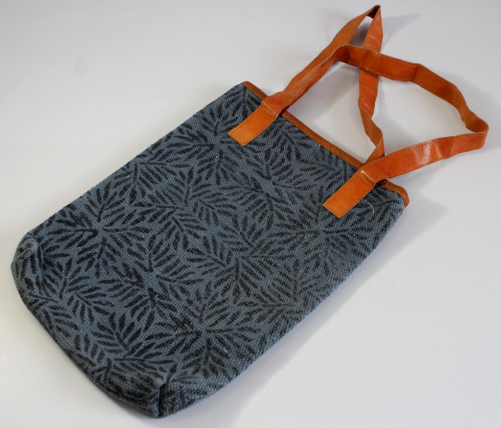 Hand woven cotton kelim / dhurries hand bag with genuine leather used decoratively at the edges as piping. Inside is cotton fabric lining. For closure, a touch button is given. Tu rely ethnic product from the cottage industry of Thar Desert of Western India, Rajasthan.