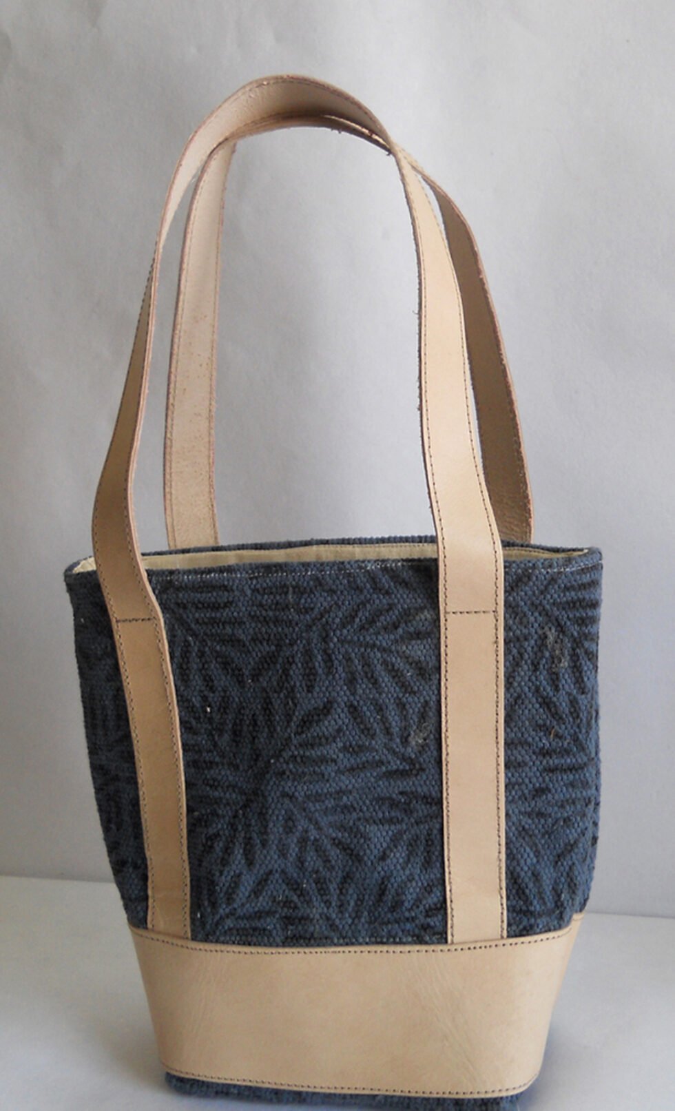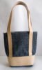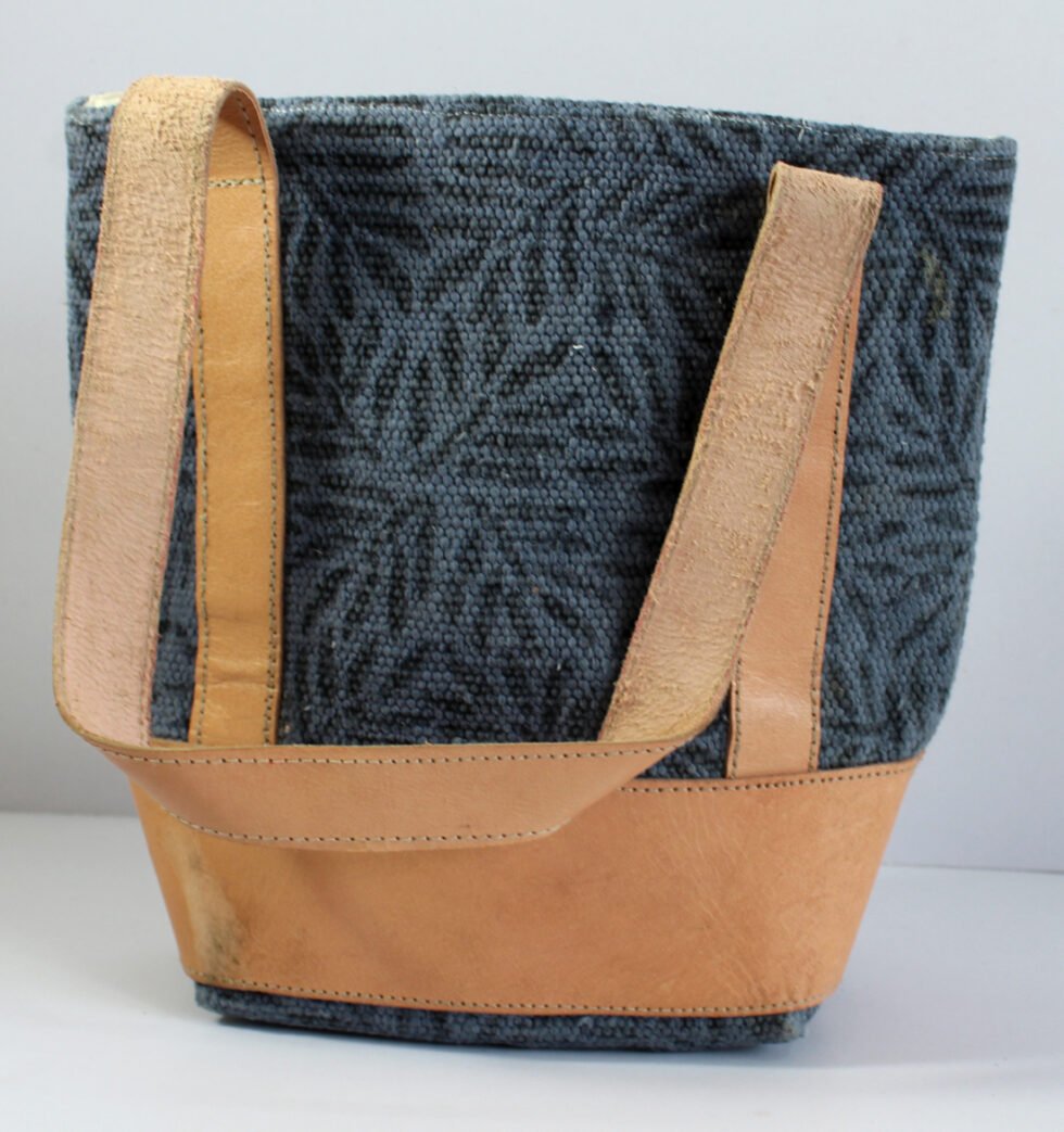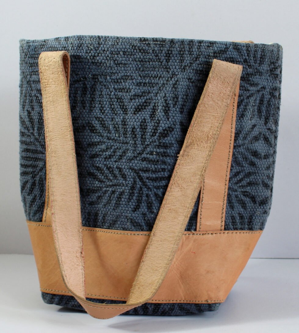 Hand woven cotton kelim / dhurries hand bag with genuine leather used decoratively at the edges as piping. Inside is cotton fabric lining. For closure, a touch button is given. Turely ethnic product from the cottage industry of Thar Desert of Western India, Rajasthan.