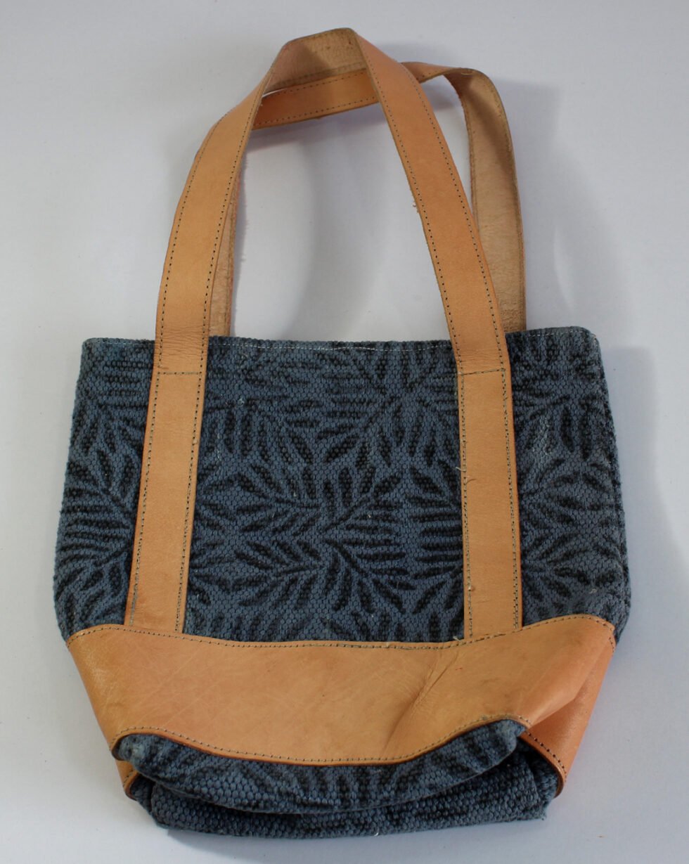 Handwoven kilim handbag with leather piping and touch-button closure. Ethnic craft from Rajasthan.