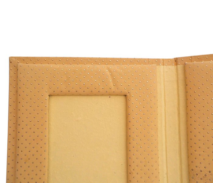 Photo frame made of recycled handmade cotton paper with Dew Drop metallic silver print all around it! Further, foam & cardboard is used to shape it up. A lovely ‘Green Life Style’ product for home decoration. Acetate is provided in the middle to protect photo.