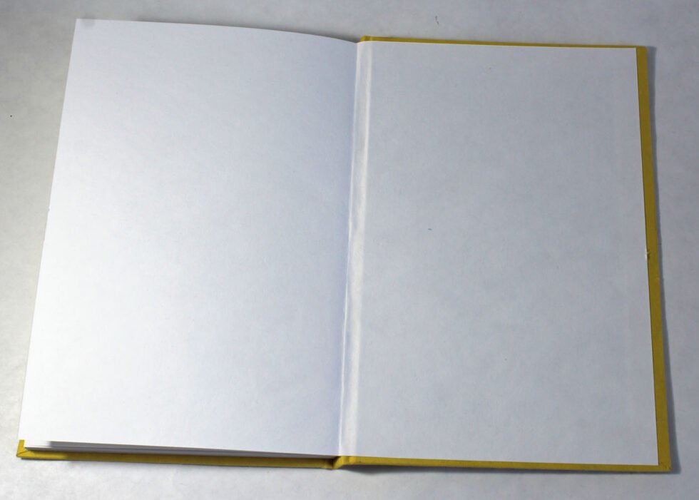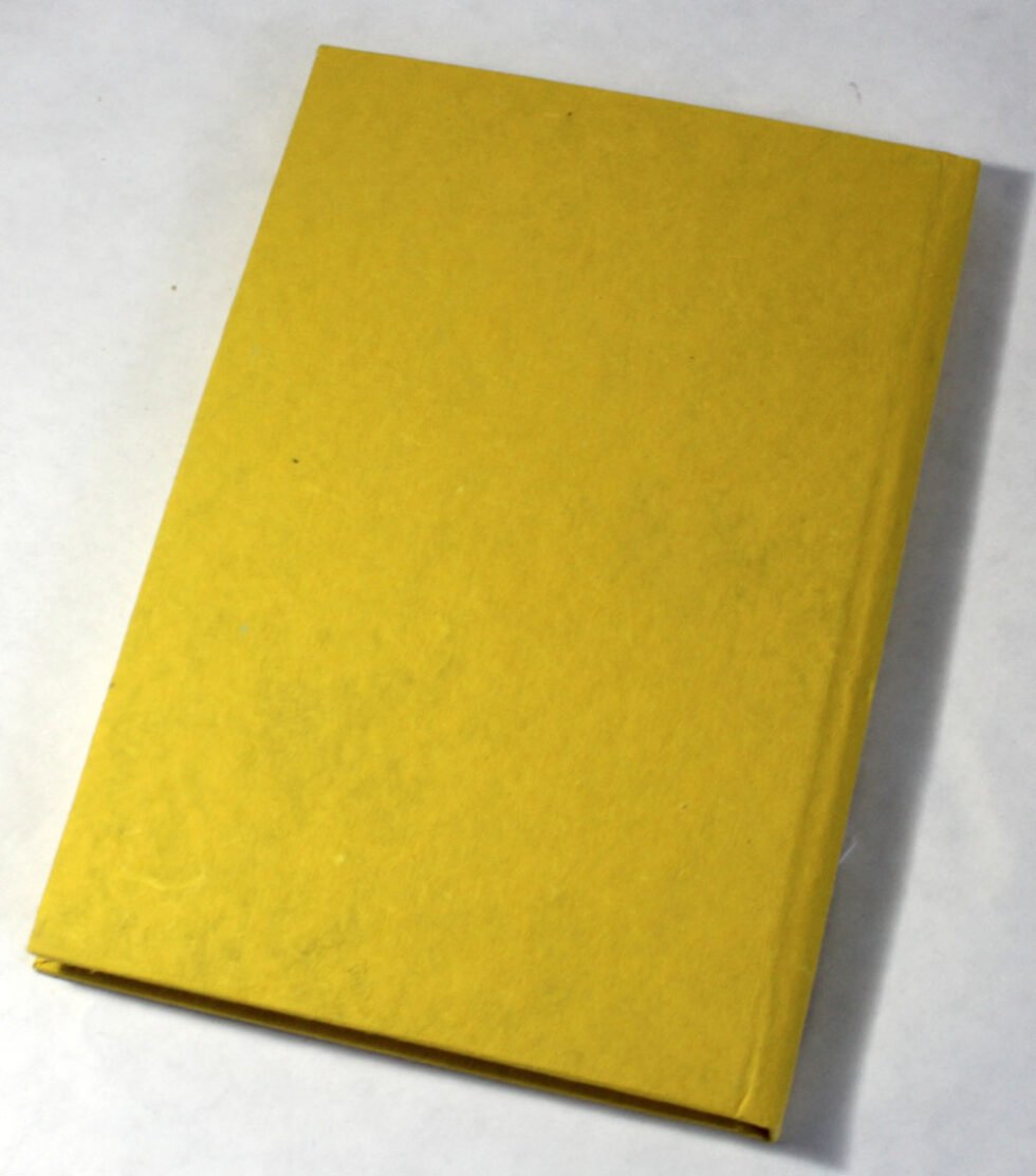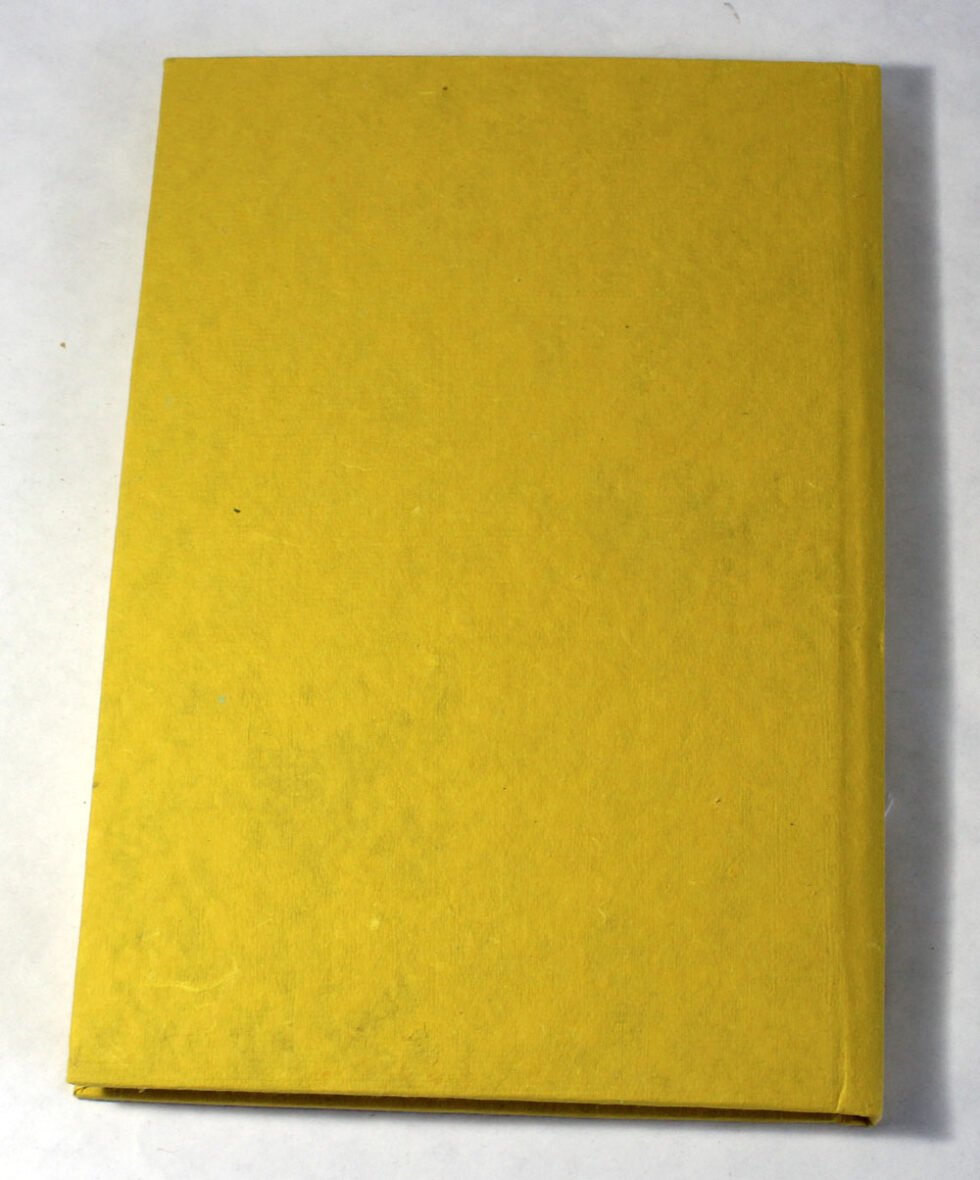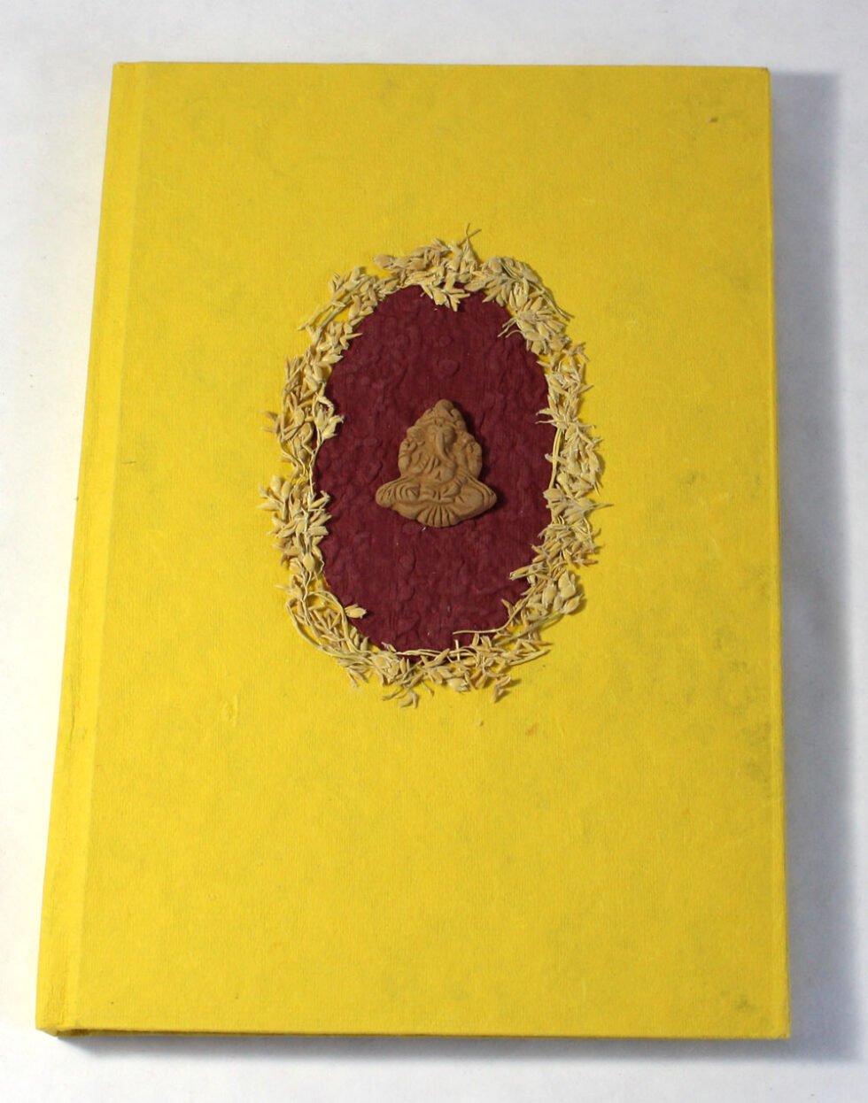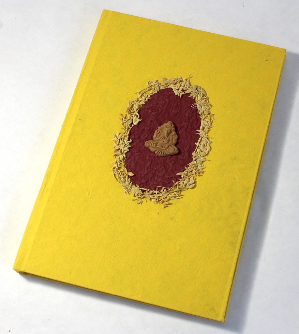 Beautiful collage design by gluing down a special paper in oval shape known as ‘Moon Rock’ on the front cover of the notebook. Further surrounded by the auspicious white grass around its border. In the centre, Lord Ganesh – The God of wisdom & Wealth, is placed, making it a very unique Diwali Present! A beautiful aesthetically made symbolic Diwali Present, and very auspicious too, for someone you wish very special! Just inside both the covers, front and back, there is another thick cream colour wood free / acid free paper sheet layer, holding the inside writing pages gracefully. In the middle, 48 sheets / 96 pages for smooth writing which never bleed with the ink or in calligraphy and can be a lovely travel book / art and craft book or a book – keeping domestic accounts and other valuable notes & details.