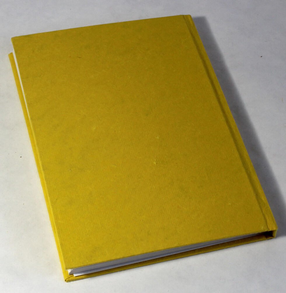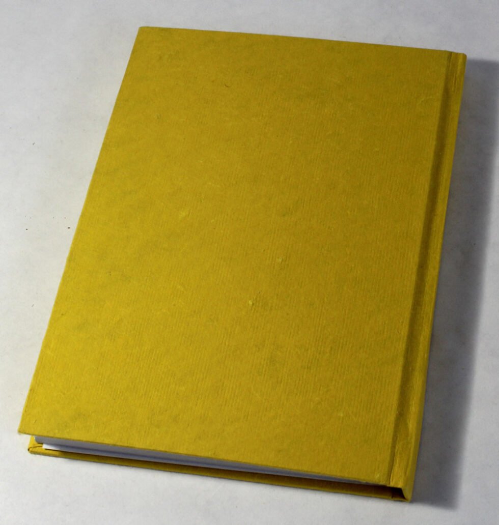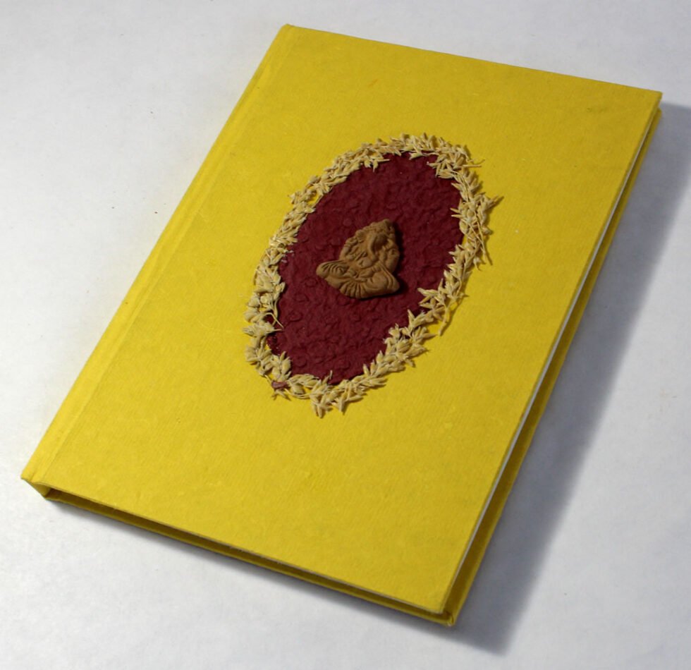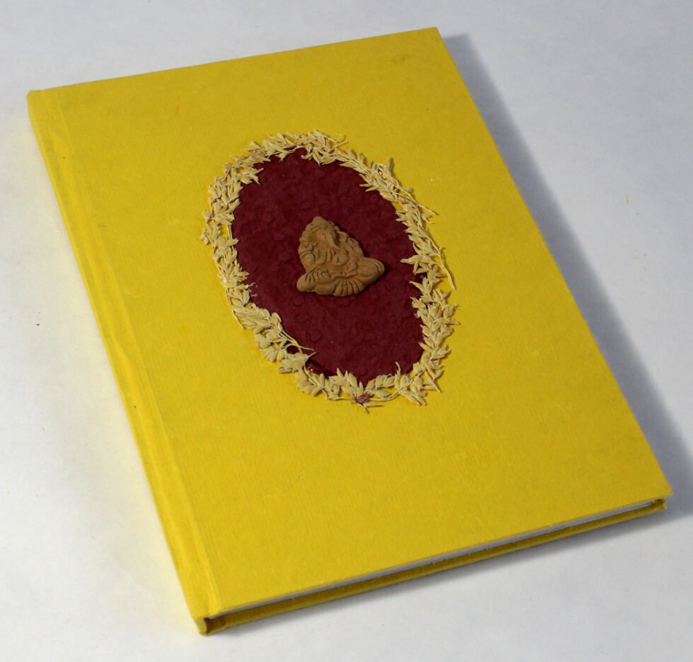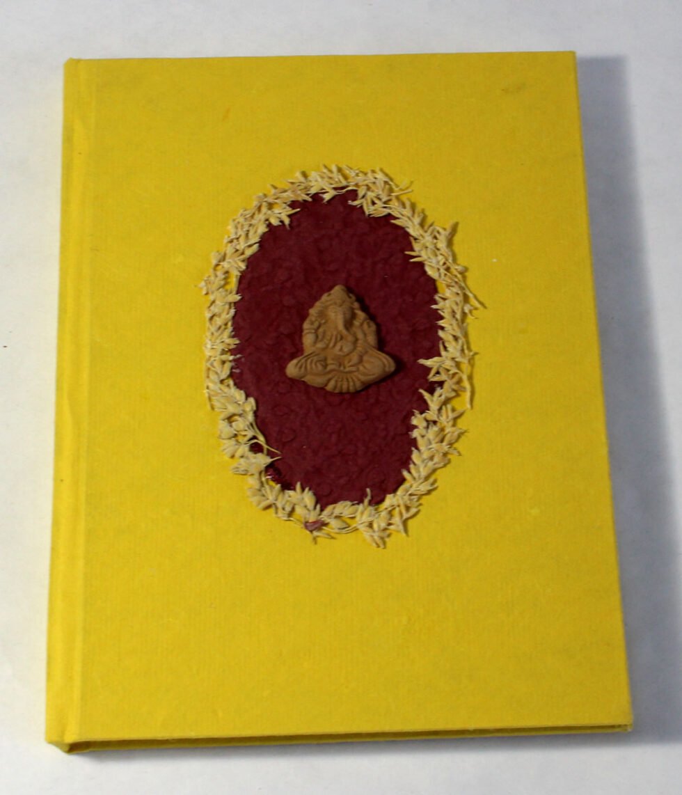 Beautiful collage design by gluing down a special paper in oval shape known as ‘Moon Rock’ on the front cover of the notebook. Further surrounded by the auspicious white grass around its border. In the centre, Lord Ganesh – The God of wisdom & Wealth, is placed, making it a very unique Diwali Present! A beautiful aesthetically made symbolic Diwali Present, and very auspicious too, for someone you wish very special! Just inside both the covers, front and back, there is another thick cream colour wood free / acid free paper sheet layer, holding the inside writing pages gracefully. In the middle, 48 sheets / 96 pages for smooth writing which never bleed with the ink or in calligraphy and can be a lovely travel book / art and craft book or a book – keeping domestic accounts and other valuable notes & details.